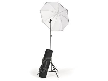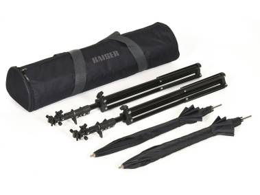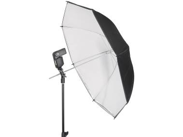 2 Reflex-/Durchlichtschirmen, ø 90 cm, innen mit weißem Stoffbezug, außen mit abnehmbarer Reflexbespannung und