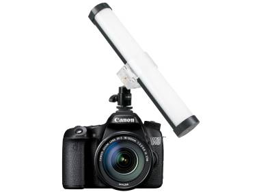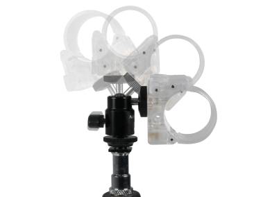 Transparente Rohrschelle mit Clipverschluss, auf Kugelgelenk mit Aufsteckfuß. Zur variablen Befestigung der Mini-Farb-Effektleuchte PavoTube II 6C RGBWW (3708) im Zubehörschuh einer Kamera oder auf Stativen und Halterungen mit Anschlussgewinde 1/4".