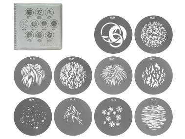 Bestehend aus 10 verschiedenen Metall-Gobos (Schattenmasken). Zur Verwendung in den Projektionsvorsätzen PJ-FMM-19 (3760) und PJ-FMM-36 (3761).