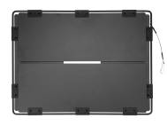 Lieferumfang: Leuchte mit Lichtklappenvorsatz, Netzteil mit Netzteilhalterung, Netzkabel und Tragekoffer.