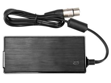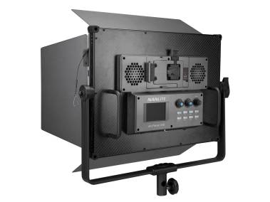 Stromversorgung über mitgeliefertes Netzteil. Befestigung über Netzteilhalterung im V-Mount-Anschluss an der Rückseite der Leuchte. Für den mobilen, netzunabhängigen Einsatz Betrieb mit V-Mount-Akku möglich (nicht im Lieferumfang).