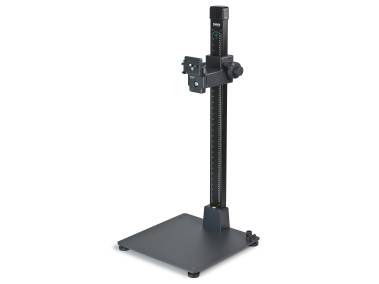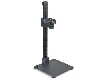 Breite und extrem vibrationsarme Führungssäule aus Aluminium-Profilrohr, mattschwarz eloxiert, mit cm- und inch-Skalen. Mit Haltearm und Befestigungsvorrichtung für Kameraarme und Gerätekopfunterteil 4568. Höhenverstellung mit Handkurbel.