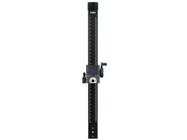 Breite und extrem vibrationsarme Führungssäule aus Aluminium-Profilrohr, mattschwarz eloxiert, mit cm- und inch-Skalen. Mit Haltearm und Befestigungsvorrichtung für Kameraarme und Gerätekopfunterteil 4568. Höhenverstellung mit Handkurbel.
