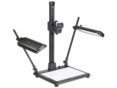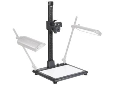 Reprostativ mit integrierter Durchlichteinheit. Leuchtgrundplatte mit 504 SMD-LEDs, 5400 Kelvin Tageslicht, Farbwiedergabeindex CRI > 96, nutzbare Leuchtfläche 50,6 x 36 cm (> DIN A3+), Leuchtdichte ca. 13000 cd/m², Helligkeit stufenlos regelbar, flimmerfreier Betrieb. Montagevorbereitung für optionale Auflichtbeleuchtungen RB 5270 DX (5278), RB 5240D (5269), RB 521 AB (5282) oder RB 525 AS (5284). Höhenverstellbare Füße. Wasserwaage im Sockel.