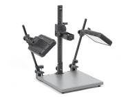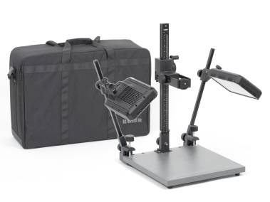 Transportables, zusammenklappbares Reprostativ, inkl. LED-Beleuchtungseinrichtung mit zwei Tageslicht-Leuchten PL 24D. In stabilem Transportkoffer.