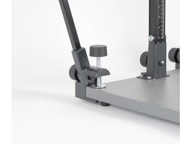 Reprostativ RS 2 CP (5301), mit reflexfreiem, mattgrau beschichtetem Grundbrett mit aufgedrucktem Feinraster sowie cm- und inch-Skala. Führungssäule aus mattschwarz eloxiertem Aluminiumprofil mit cm- und inch-Skala. Höhenverstellung durch kunststoffgelagerten Friktionstrieb mit Handkurbel. Kameraarm horizontal verstellbar zur Änderung des Abstandes von der Führungssäule, Verstellweg ca. 7 cm. Anschlussgewinde 1/4“. Säule lässt sich flach an das Grundbrett anklappen.