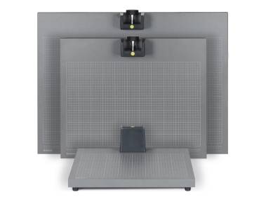 Mattgrau beschichtetes Grundbrett mit montiertem Sockel zur Befestigung der Führungssäule. Aufgedrucktes Feinraster, cm- und inch-Skala. Wasserwaage im Sockel. Einzeln höhenverstellbare Füße.![]()
