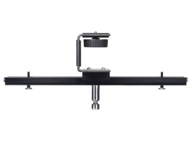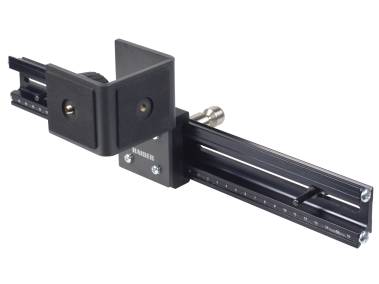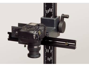 Mit horizontal in Rechts-Links-Richtung verschiebbarem, arretierbarem Kameraträger. Einstellbare Anschläge für Kameraendposition. Kamera kann in Quer- und Hochformatstellung montiert werden. Ideal in Verbindung mit Buchhalterung 5771 beim seitenweisen Reproduzieren aus Büchern.
