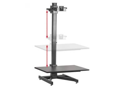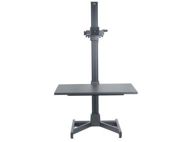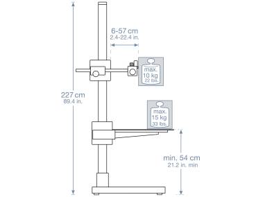 Repro-Bodenstativ zur digitalen und analogen Bilderfassung von Vorlagen bis zu 129 x 89 cm (> DIN A0) mit zwei motorisch verstellbaren Ebenen. Extrem stabile Führungssäule aus Mehrkammer-Spezialprofil, mattschwarz eloxiert, mit aufgedruckten cm- und inch-Skalen. Säulenfuß aus doppelt verstrebtem Stahlrohr. Aluminiumguss-Sockel zur Aufnahme der Führungssäule, mit eingebauter Wasserwaage. Vier getrennt nivellierbare Füße.