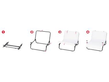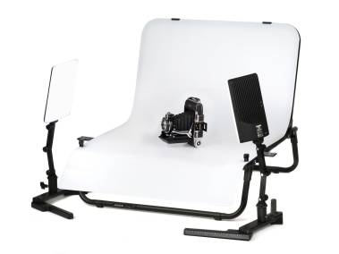 Kompakter Aufnahmetisch für die Fotografie kleiner Objekte ohne störenden Hintergrund. Bestehend aus einem zusammenklappbaren Stahlrohrgestell und weißer, durchleuchtbarer Kunststoffplatte mit vorgeformter runder Frontkante. Einfacher Auf- und Abbau ohne Werkzeug, platzsparende Aufbewahrung. Basisgestell mit rutschhemmenden Füßen.