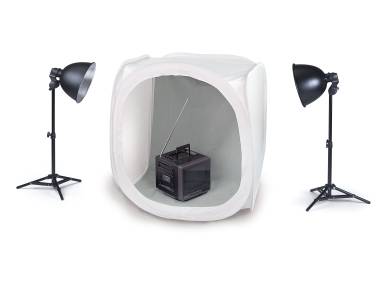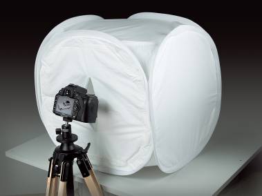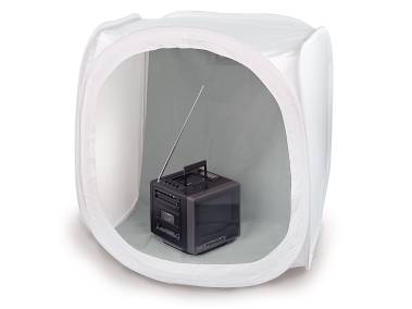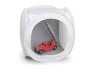 Würfelförmiges Lichtzelt für eine gleichmäßige und weiche Beleuchtung des Aufnahmeobjekts. Abnehmbare Frontabdeckung mit Schlitz für das Kameraobjektiv. Einfacher Aufbau durch Auffalt-Automatik. Dank des flexiblen Rahmens sehr kompakt zusammenlegbar.