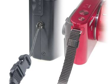 Bei Befestigung an Kompaktkameras lässt sich der Gurt über Schnellverschlüsse problemlos von der Kamera abnehmen.