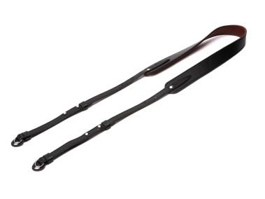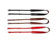 Handgefertigter Kameragurt aus hochwertigem italienischem Leder. Breite, ergonomisch geformte Schulterauflage mit sorgfältig gearbeiteter Innenschicht aus geschmeidigem Leder für hohen Tragekomfort auf Schulter oder Nacken. Spezielle Oberflächenbehandlung zur Verhinderung des Abfärbens auf hellen Kleidungsstücken. Dreifache Längenverstellung über beidseitige Metallpins. Befestigung über Ringösen mit Schutzlaschen.