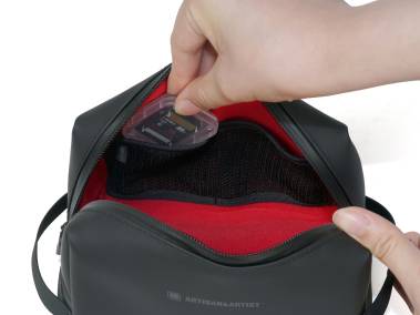 Zwei Netztaschen an der Innenseite für Kleinzubehör, Speicherkarten etc. Deckel mit 2-Wege-Reißverschluss für schnellen Zugriff. Beschriftungsfach für Adresse oder Inhalt an der Vorderseite.