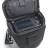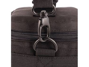 Mit Netztaschen auf der Innenseite des Außendeckels sowie an beiden Seiten. Außendeckel mit Reißverschluss. Zwischendeckel mit Zubehörfächern, der sich über Klettverschluss mit dem Außendeckel verbinden lässt. Geräumige Vortasche mit Organizerfächern und Reißverschluss.