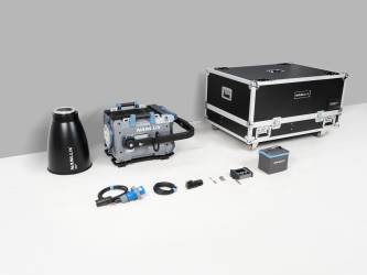 Lieferumfang: Scheinwerfer mit Schutzkappe, Montagebügel, Reflektor RF-NL-L-30 (30°), Anschlusskabel (2 m), USB-Stick sowie Kabel-Fernbedienung WC-EXT mit 8 m Kabel, Magnetplatte und Aufbewahrungstasche. In Flightcase.