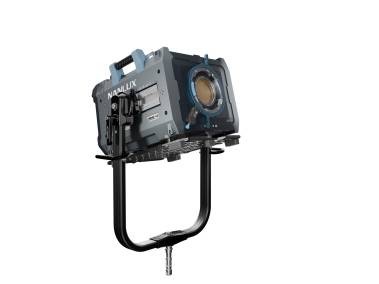 Montagebügel zum stufenlosen Schwenken des Scheinwerfers. Mit Einhebel-Verriegelung, Scheibenbremse und Markierungen zum reproduzierbaren Einstellen des Neigungswinkels. Befestigung auf geeigneten Stativen und an Halterungen mit 28 mm-Normhülse. Der Scheinwerfer ist nach Lösen einer beidseitigen Sicherheitsverriegelung vom Montagebügel abnehmbar.