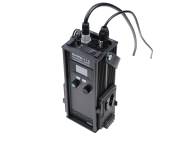 Separate Steuereinheit mit Bedienelementen und übersichtlichem 2,0“-Farb-Display sowie Anschlüssen für zwei V-Mount-Akkus, DMX/RDM-Adapterkabel, 48 V DC, usw. USB-Buchse für Firmware-Update. Tragegriff. Befestigung der Steuereinheit am Leuchtenstativ mittels mitgelieferter Stativklammer mit Schnellkupplung. 4,50 m-Netzkabel.