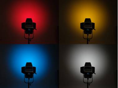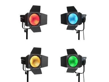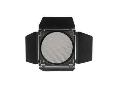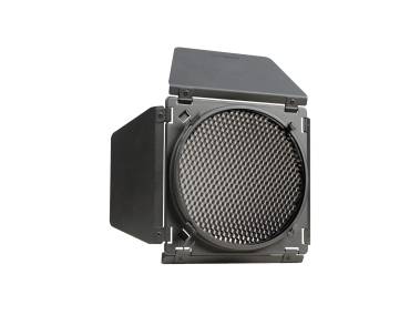 Metallrahmen mit vier Lichtklappen für gezielte Lichtführung und zur Verminderung von Streulicht. Abstrahlwinkel stufenlos verstellbar.