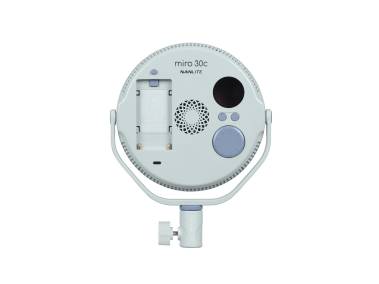Rundes, flaches Kunststoffgehäuse mit 16,7 cm Durchmesser, mit Aufnahmefach für einen NP-F-Akku bzw. die optionale Powerbank-Halterung.