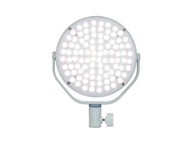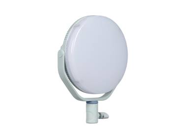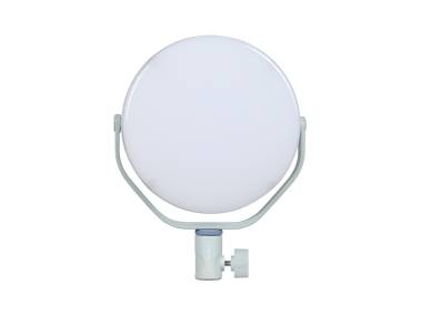 Runde, multifunktionale Full-Color-Flächenleuchte mit modernem Design, leicht und kompakt, mit flachem Kunststoffgehäuse und Montagebügel. Im Gegensatz zu typischen rechteckigen Flächenleuchten erzeugt die runde Form natürliche Lichtreflexe in den Augen für Porträts, Interviews und Social-Media-Aktivitäten.
