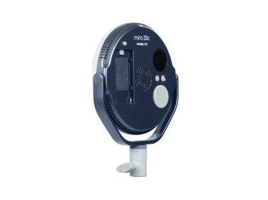 Rundes, flaches Kunststoffgehäuse mit 16,7 cm Durchmesser, mit Aufnahmefach für einen NP-F-Akku bzw. die optionale Powerbank-Halterung.