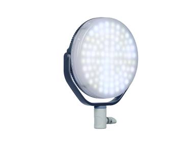 Runde, multifunktionale Full-Color-Flächenleuchte mit modernem Design, leicht und kompakt, mit flachem Kunststoffgehäuse und Montagebügel. Im Gegensatz zu typischen rechteckigen Flächenleuchten erzeugt die runde Form natürliche Lichtreflexe in den Augen für Porträts, Interviews und Social-Media-Aktivitäten.