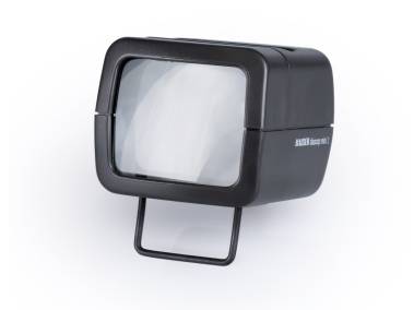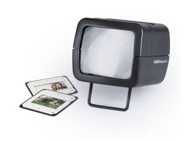 Small compact slide viewer for framed slides 5 x 5 cm (2 x 2 in.). With hinged prop.