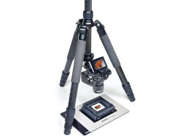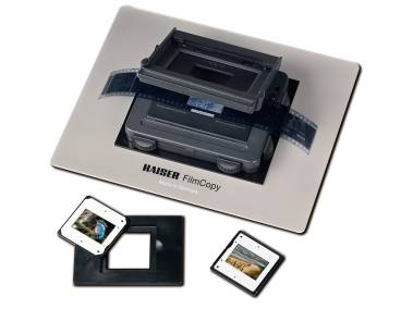 The FilmCopy Vario Kit (2458) already includes the super flat “slimlite plano” LED light box (2453) for viewing and sorting slides and negatives and for illumination during digitization (illuminated area 22 x 16 cm (8.7 x 6.3 in.), 5000 Kelvin daylight, CRI = 95, continuously dimmable, battery and mains operation).