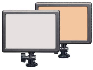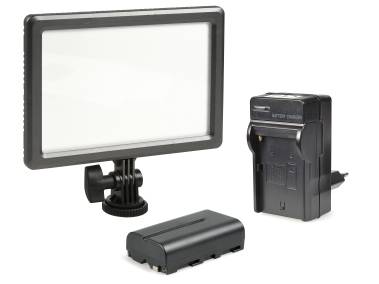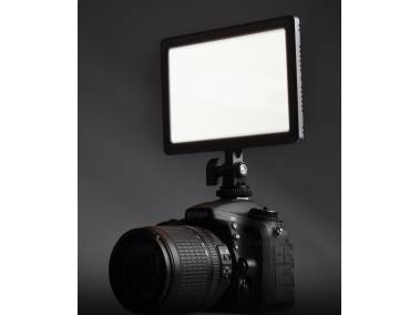 Bi-color camera light with particularly slim housing (only 18 mm/0.7 in) and soft dazzle-free light. Comes with lithium-ion battery and charger.