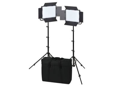 each with 900 LEDs (CRI ≥ 95, TLCI = 93), control dial for color temperature (3200 up to 5600 Kelvin) and dimmer, built-in radio receiver, swiveling mounting bracket, four large barn doors, mains adapter and mains adapter support, diffusor screen, soft screen, blue filter and case for two screens