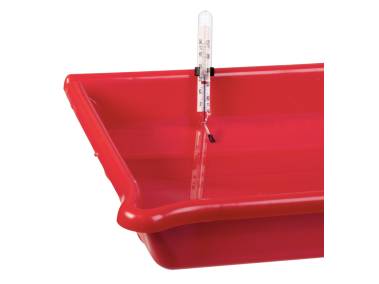 With angled stem and hook for hanging it on tray’s edge. Alcohol-filled bulb. Centigrade and Fahrenheit scales: 0 ... 50° C/32 ... 120° F. With marking at 18°C/64°F. Length: 85 mm + 40 mm of angled stem (3.3 + 1.6 in.), ø 10 mm (.4 in.)![]()