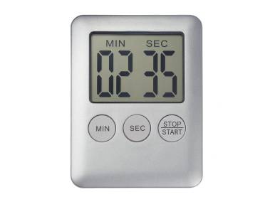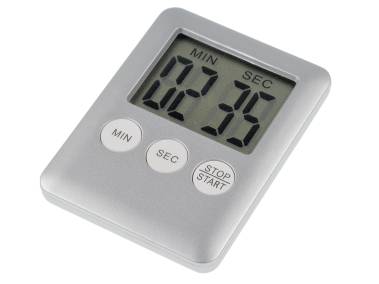Count-down timer and count-up timer (stop watch) with four-figure LCD display. Up to max. 99 minutes 59 seconds, counts in one second steps. Interruption possible. Acoustic alarm for count-down to zero. Set starting time retrievable. Magnet on the back for simple fixing to metal surfaces.
