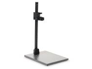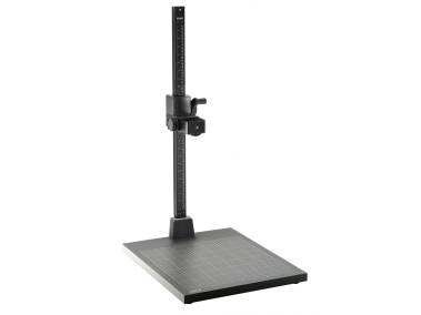Non-reflective matt grey baseboard with printed fine grid and cm/inch scale. Matt-black anodised aluminum section tube column with cm/inch scale. Hand-cranked height adjustment by friction drive in plastic bearings. Column can be mounted rotated 180°. With horizontally adjustable camera arm to change the distance to the column, moves approx. 7 cm (2.7 in.) back and forth. 1/4” mounting thread.