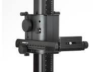 Column made of special aluminum multisection tubing, matt black anodized, with cm and inch scales. Camera carrier made of aluminum section, can be horizontally adjusted over approx. 16 cm (6.3 in.) with rack-and-pinion parallel guides. Left hand/right hand operation, two blocking screws prevent inadvertent changing of the adjusted position. Camera mounting plate tiltable by ± 90°. Connecting screw horizontally adjustable. Height adjustment with hand crank (5602) or motorized (5603). Large non-reflecting matt grey base plate with printed grid, cm and inch scales. Feet adjustable in height. Spirit level.