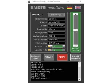 “Kaiser autoDrive" control program for computer-controlled height adjustment via PC/laptop and for brightness control of the RB 570 AX LED lighting unit (5652). Height positions can either accessed directly or by retrieving one of 500 possible saved “projects” including height position and brightness values.