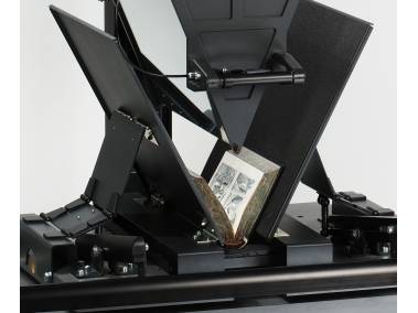 The opened book is placed in a V-shaped book cradle and retained there. A V-shaped wedge with a glass plate on one side and a mirror on the opposite side is moved manually into the opened book and is locked into position. The two side rests, that are opened at an angle of a bit more than 45° are now manually moved to the book cover at exactly 45°. The glass plate of the wedge flattens the page that has to be reproduced. The mirror image is now digitally photographed or scanned. A suitable software will now convert the digital image into a true sided image.