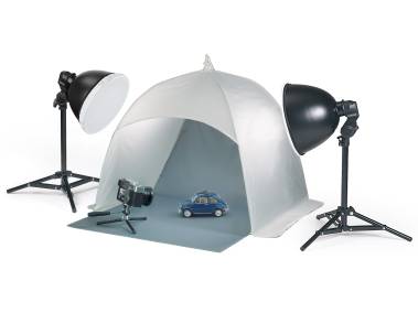 For small object photography. Suitable for product shots and internet images. White translucent surfaces provide for even and soft illumination. Umbrella-type construction makes set-up and fold-down easy. Comes with reversible textile background (white and grey) and protective cover with carrying straps.