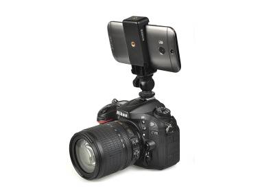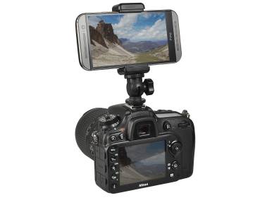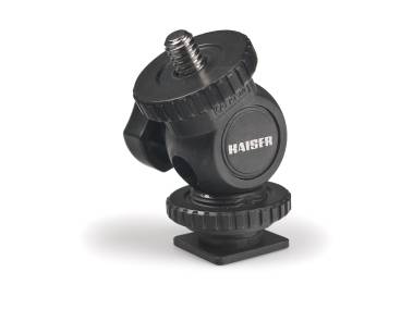 Tilts continuously up to 90° and rotates up to 360°. Central locking screw. Connection thread 1/4". Mounts on the accessory shoe or a tripod. Tripod thread 1/4". Lock rings for secure hold.