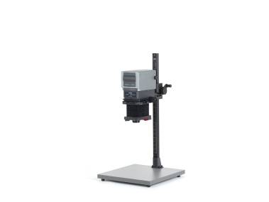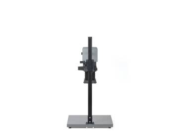 Reflexfreies, mattgrau beschichtetes Grundbrett mit aufgedrucktem Feinraster und cm- und inch-Skala sowie Metallsockel für die Führungssäule.