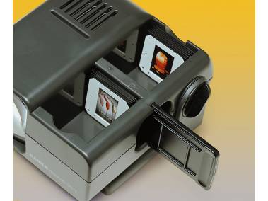 Dia-Betrachter mit 3-fach vergrößernder Doppellinse für gerahmte Dias 5 x 5 cm und ungeschnittene Filmstreifen, Wechselschieber für komfortablen Diawechsel ohne störende Hellphase, Fallschacht für bis zu 40 Dias. Schwenkbares Oberteil zur Einstellung des gewünschten Betrachtungswinkels, Netzbetrieb.