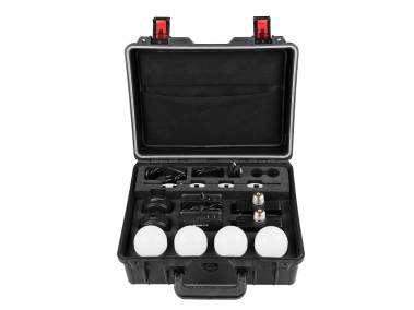 Lieferumfang: 4 x Farb-Effektleuchte PavoBulb 10C, 2 x Standfuß AS-MBA-E27 (3678), 2 x Akku-Adapter BT-BA-SNP-E27 (3679), 2 x Kabel-Fernbedienung WC-USBC-C1 (3683), 2 x USB-Kabel (USB/USB-C), 4 x Bouncer AS-BSC (3680), 1 x Netzkabel und 1 x Transportkoffer.