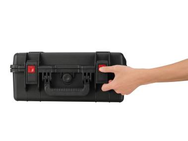 Robuster Transportkoffer mit Formeinsatz für Leuchten und Zubehör.