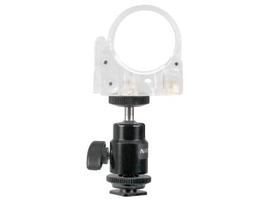 Transparente Rohrschelle mit Clipverschluss, auf Kugelgelenk mit Aufsteckfuß. Zur variablen Befestigung der Mini-Farb-Effektleuchte PavoTube II 6C RGBWW (3708) im Zubehörschuh einer Kamera oder auf Stativen und Halterungen mit Anschlussgewinde 1/4".