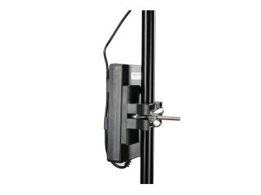 Aufklappbare Stativklemme an der Rückseite der Akku-Halterung zum Befestigen an Stativen mit unterschiedlichen Rohr-Durchmessern (19 – 36 mm).