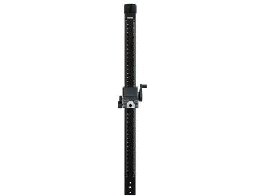 Breite und extrem vibrationsarme Führungssäule aus Aluminium-Profilrohr, mattschwarz eloxiert, mit cm- und inch-Skalen. Mit Haltearm und Befestigungsvorrichtung für Kameraarme und Gerätekopfunterteil 4568. Höhenverstellung mit Handkurbel.