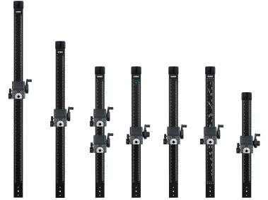 Breite und extrem vibrationsarme Führungssäule aus Aluminium-Profilrohr, mattschwarz eloxiert, mit cm- und inch-Skalen. Mit Haltearm und Befestigungsvorrichtung für Kameraarme und Gerätekopfunterteil 4568. Höhenverstellung mit Handkurbel.