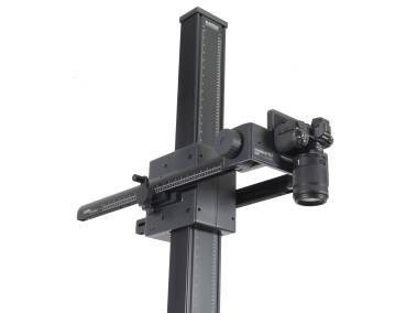 Extrem stabile Führungssäule aus Mehrkammer-Spezialprofil, mattschwarz eloxiert, mit aufgedruckten cm- und inch-Skalen und zwei motorisch verstellbaren Ebenen.