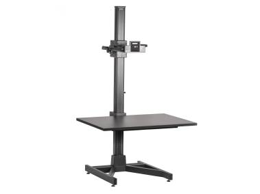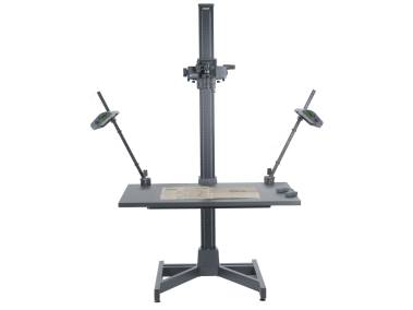 Repro-Bodenstativ zur digitalen und analogen Bilderfassung von Vorlagen bis zu 129 x 89 cm (> DIN A0) mit zwei motorisch verstellbaren Ebenen. Extrem stabile Führungssäule aus Mehrkammer-Spezialprofil, mattschwarz eloxiert, mit aufgedruckten cm- und inch-Skalen. Säulenfuß aus doppelt verstrebtem Stahlrohr. Aluminiumguss-Sockel zur Aufnahme der Führungssäule, mit eingebauter Wasserwaage. Vier getrennt nivellierbare Füße.