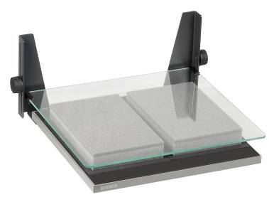 Stabile Grundplatte mit rutschfester Beschichtung oben und rutschfesten Füßen an der Unterseite. 6 mm dicke Glas-Andruckplatte in höhenvariablem Scharnier. Um in einer bestimmten Höhe ergonomischer, effektiver und vorlagenschonender arbeiten zu können, lässt sich die Höhenposition der Glas-Andruckplatte in einem Bereich zwischen 0 und 145 mm fixieren.